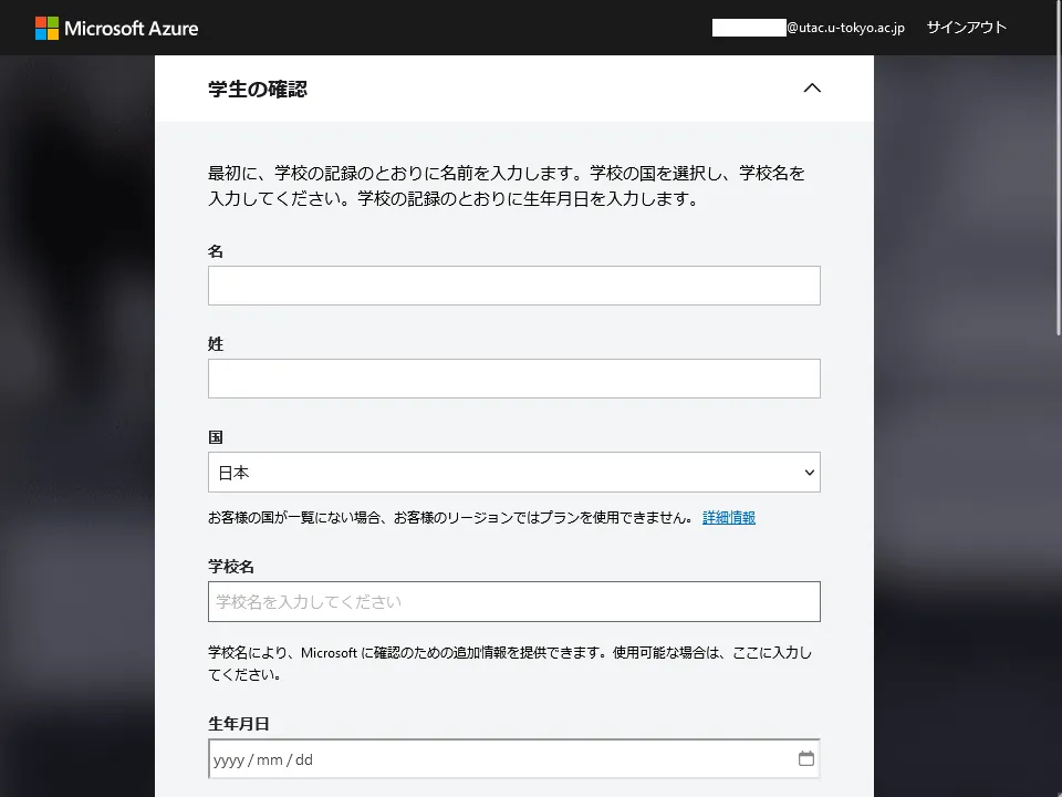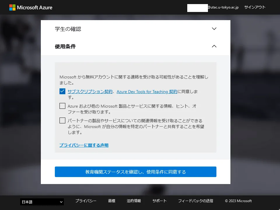 @utac.u-tokyo.ac.jp)を入力してください. - サインインが完了したら,順に「学生の確認」「使用条件」といった画面に移動します.表示される指示に従い,手続きを進めてください.